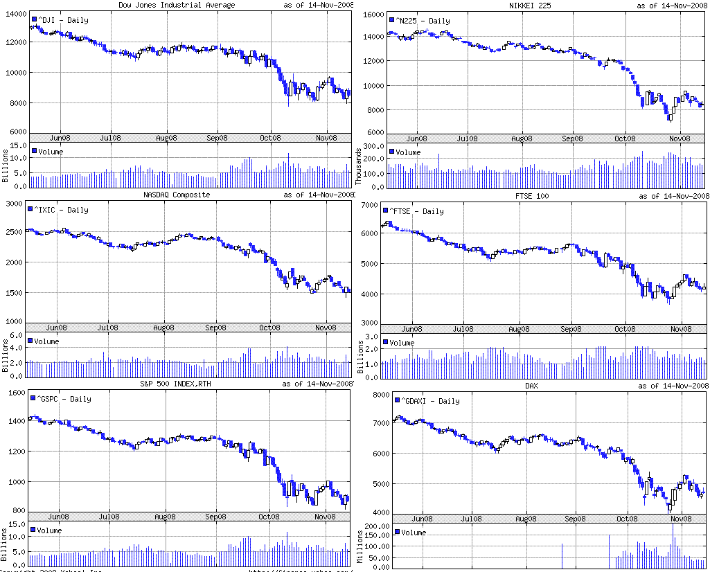 週間では、日経平均は-1.40%、TOPIXは-3.65%でした。先週末に発表された中国の総額4兆元(約57兆円)の景気刺激策を好感し月曜日の日経平均は大幅高となりましたが、それ以降はアメリカ連動で木曜まで下げ続け、金曜に少し戻して一週間を終えました。全体的に出来高が減少してきています。投機家もリスクを取れなくなっていて、投資家も景気の先行き不透明で様子見を決め込んでいるのでしょう。商いが薄い中このままデレバレッジが続くのなら、その重みでジリジリ下げていきそうな感じもします。まあ下値では、国内年金や個人の買いがある程度入るでしょうけど。。。