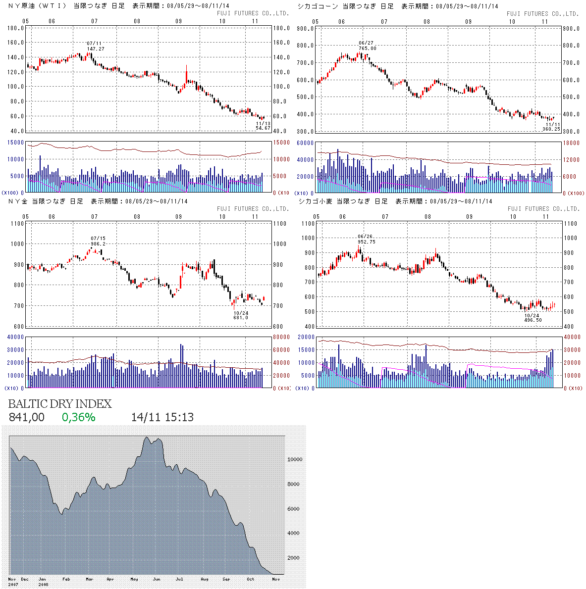 原油は下落基調。中国の景気刺激策への反応も鈍く、火曜以降はWTI 60ドル割れで推移しました。バルチックドライ指数は下げ渋っています。