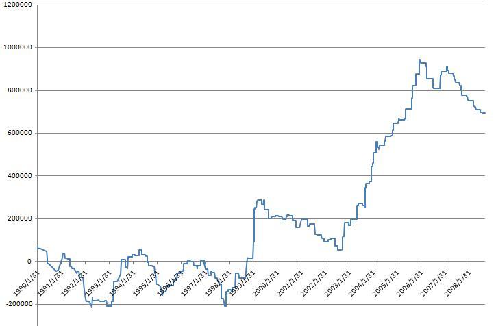 19年間での資産曲線にしてはやけにギザギザしているのは取引回数が少ないからでしょう。