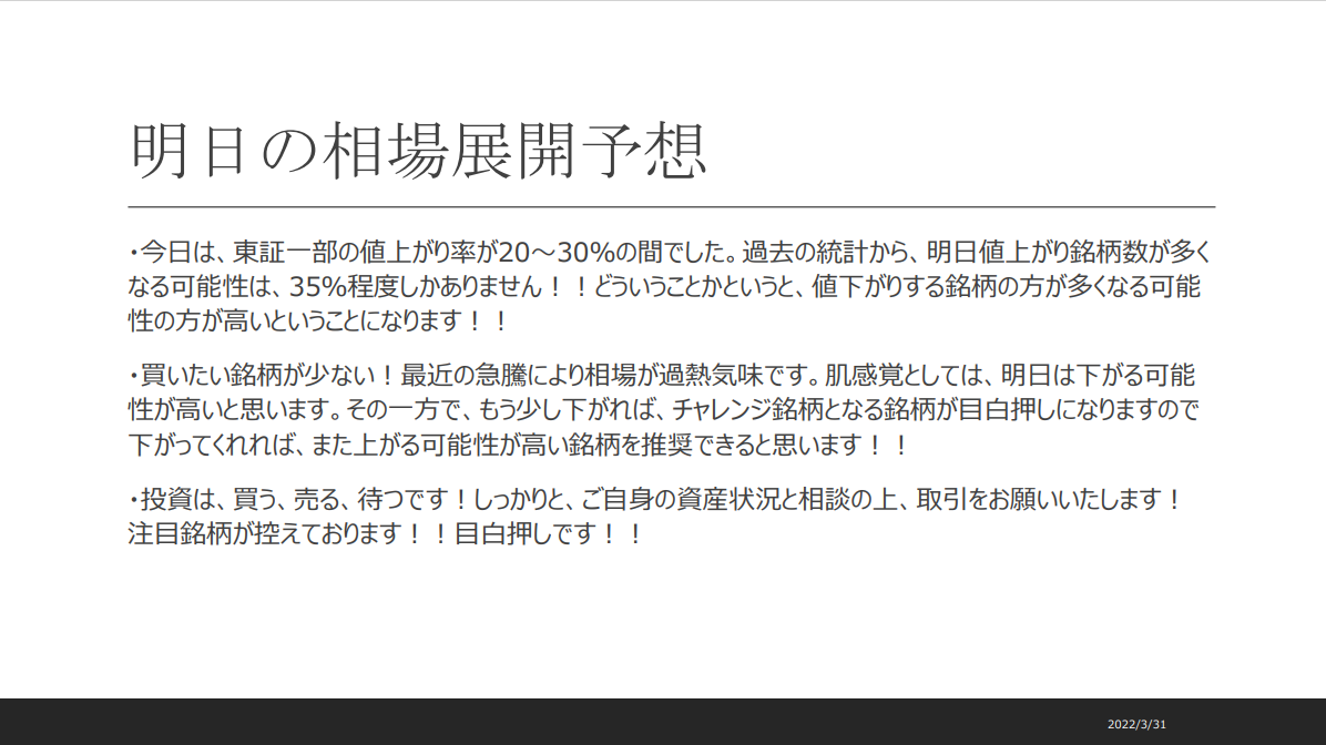 昨日の引け時に値下がり銘柄数が多くなる予想をしておりました!