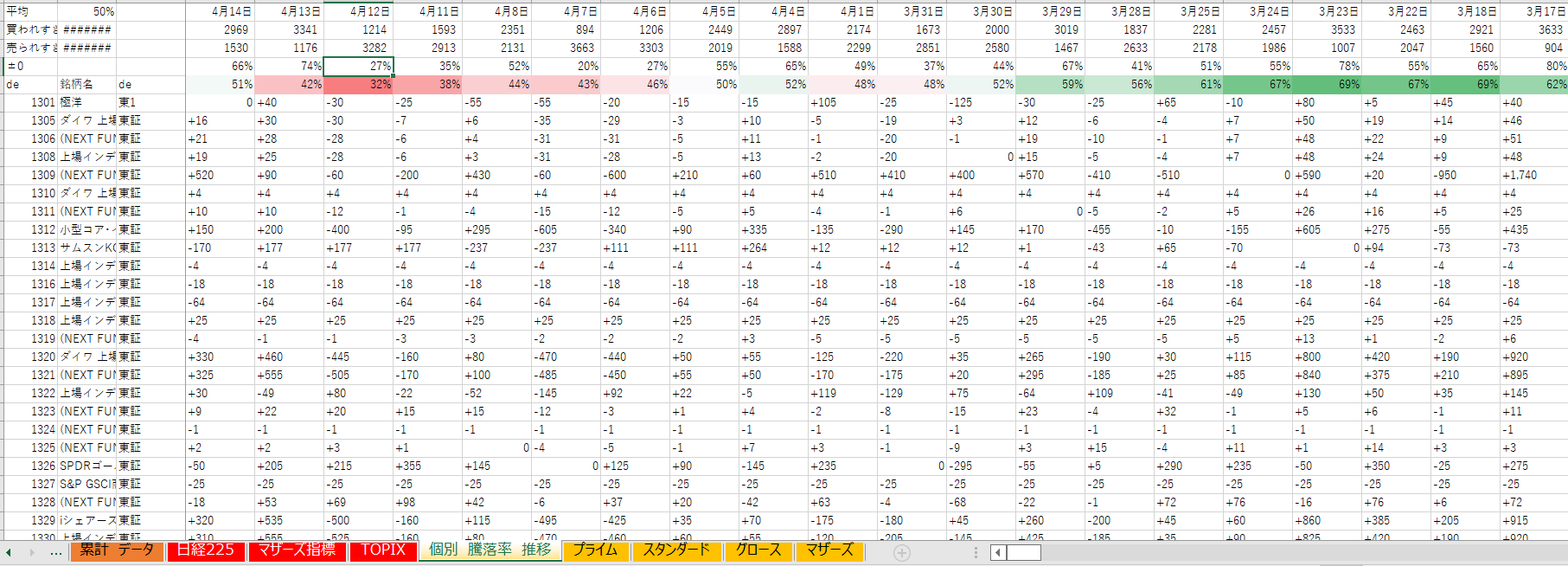 赤色 ⇒ 閑散相場、売られすぎているため買い推奨