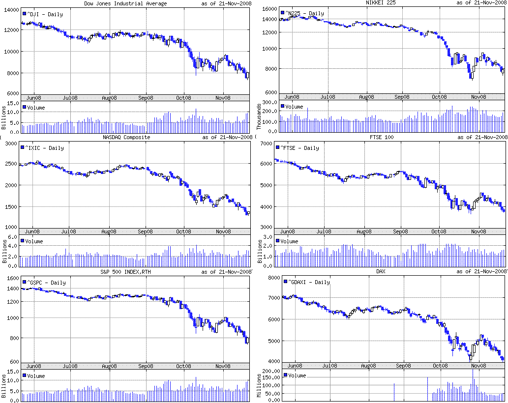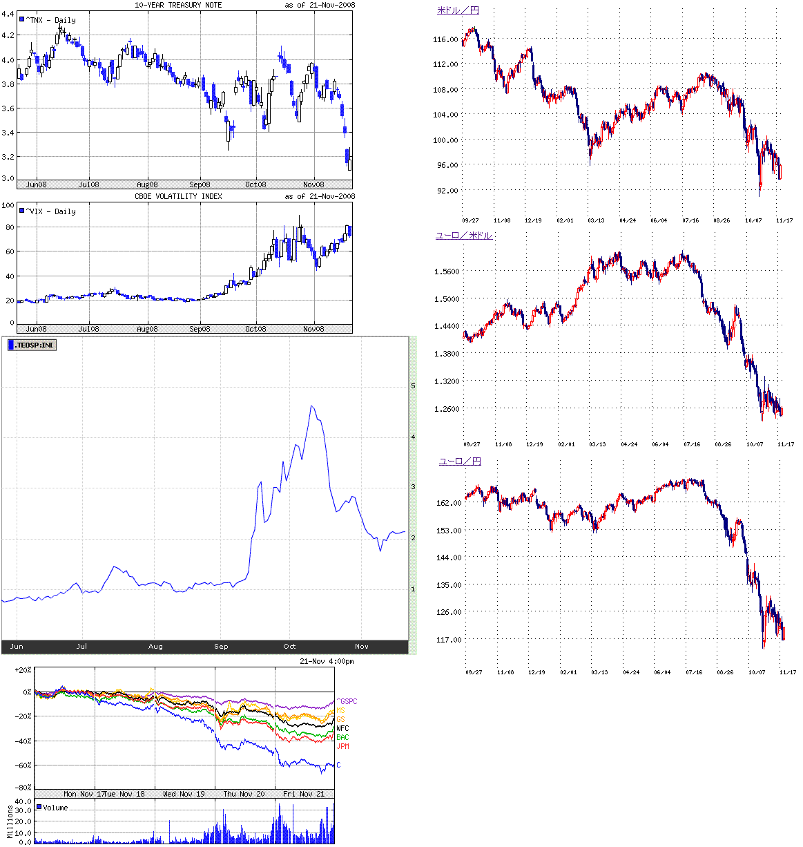 今週は金融株の下落がすごかったです。画像2左下は大手金融機関の一週間の株価チャートです。citiは今週だけで60%も下落していますね。金融株の下落は、金融不安も大きいのでしょうけど、TARPによる不良資産買い取りの可能性が低くなったことにより経営に不安があれば直接資本注入され株主価値が希薄化することが懸念されているのでしょう。citiは、政府による救済、資産売却、身売りの可能性が言われています。今のところはどの方向なのかはっきりしていないようです。
