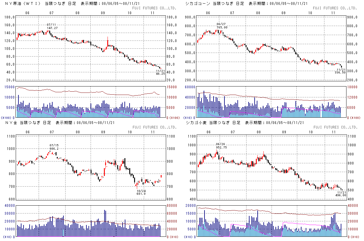 週間では、ダウは-5.3%、ナスダック指数は-8.7%、S&P500は-8.4%でした。ダウは、月曜は-223ドル、火曜は+151ドル、水曜は-427ドル、木曜は-445ドル、金曜は+494ドルと相変わらずボラの高い相場が続いています。VIX指数は、木曜の下落の際に再び80超えを記録しました。各株価指数は、週ベースでは3週続落です。ファンドの換金売りが出やすい時期なので需給が悪いせいもあるのでしょうけど、出てくるニュースも悪いものばかりですね。アノマリーからすると来週から需給がよくなりそうですが、ファンダメンタルズとセンチメントが悪いですからどうなることやら。
