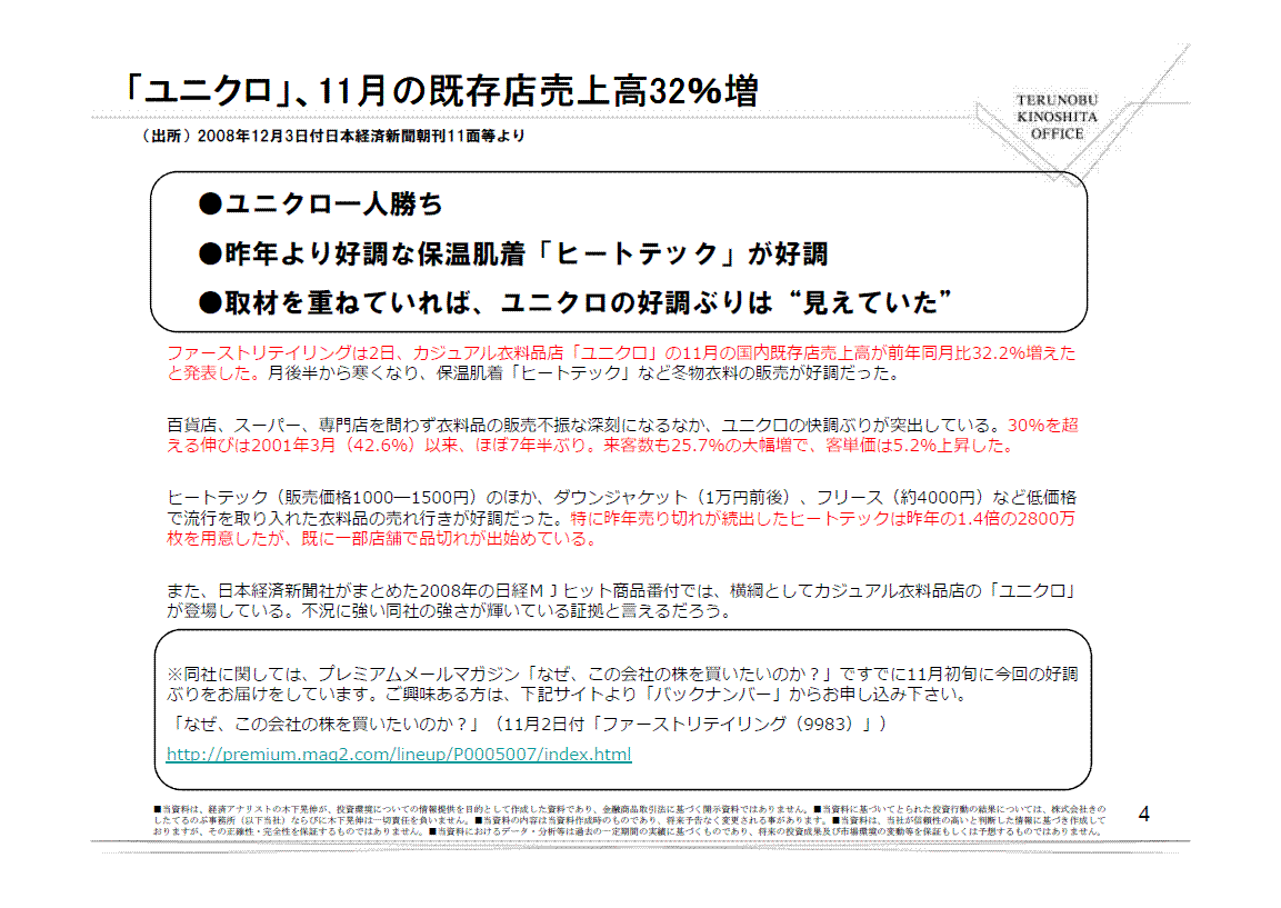そこで本日は、絶好調と言えるカジュアル衣料「ユニクロ」を展開する