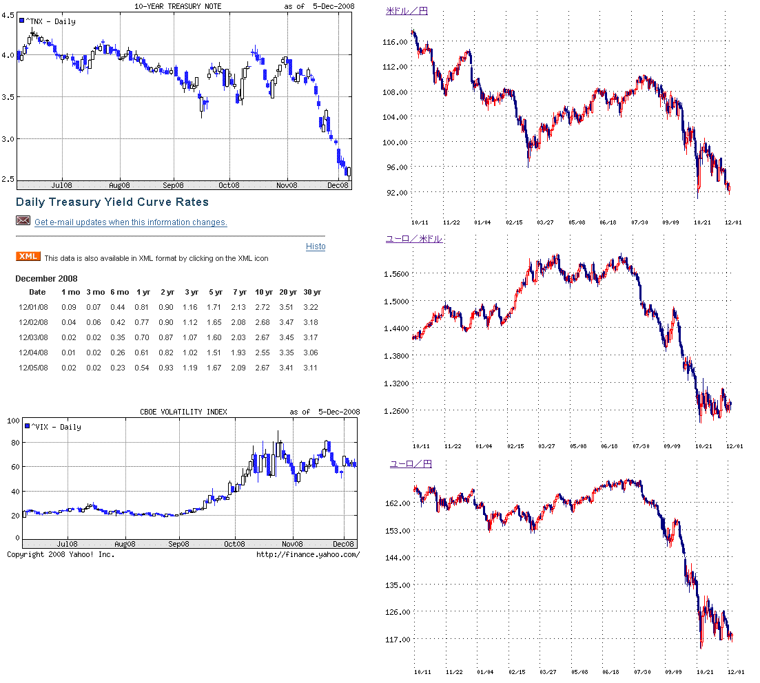 ピッグスリーの状況ですが、今日出てきた情報では、関係者の証言によると、計150億ドル程度の融資を行うことで議員たちが基本合意に達したようです。3社で340億ドルを要請していたのに比べると少なく、とりあえず延命させてあとはオバマ次期大統領まかせ・・・ってことでしょう。TARPからの融資を主張していたペロシ下院議長が譲歩して、政府側が主張していたように、環境対応車開発のための250億ドル融資枠から出すことが濃厚になったようです。金曜発表の雇用統計がひどい数字で、こりゃ今は潰せないな・・・ということで延命の方向で話が進みだしたみたいですね。