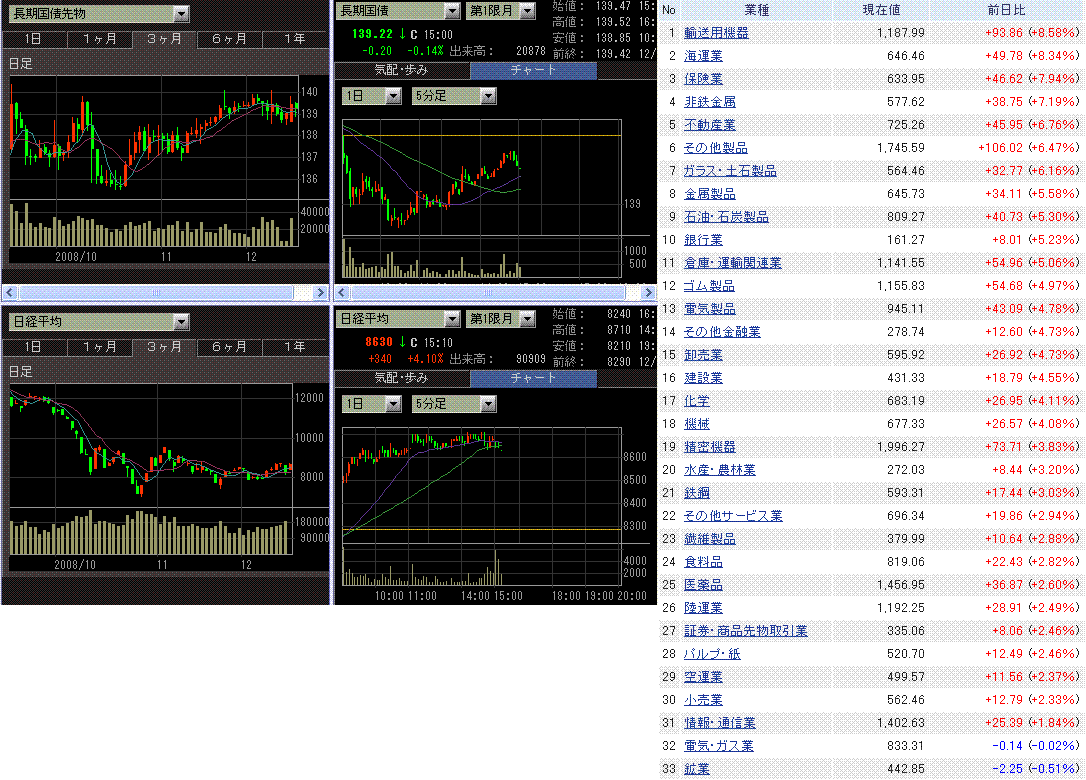 米株は反発。日本時間の昼間に、自動車メーカー救済策が廃案になったことを受けてGLOBEX米株価指数先物は大幅安でしたが、NY市場が開く少し前に、自動車メーカー救済に向けTARP活用を含めた対策を検討していると政府が表明し、米株は安寄りの後はどんどん戻していきました。次期政権で予定されている米景気刺激策では、コンピューター関連の支出が増やされそうだとペロシ下院議長が発言したため、ハイテク関連が買われ、ナスダック指数の上昇が大きかったです。