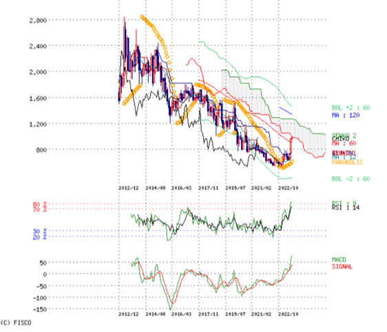 珍しく月足を見て。PBR 0.3倍なので淡々と持ち続けるし、多分買い増しすると思う。