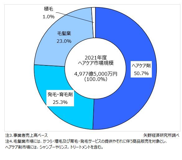 矢野経済研究所が2022年に発表したレポート「ヘアケア市場に関する調査を実施」の記事によると、「2021年度のヘアケア市場規模は前年度比109.7%の4,977億5,000万円​~経済活動が回復傾向になったこと等を背景に、サロン来店客数増加や発毛・育毛剤が好調なことで市場は拡大~」と、近年微増傾向にあるようです。