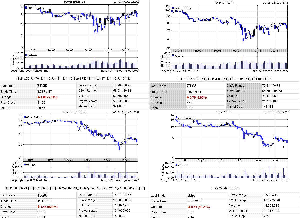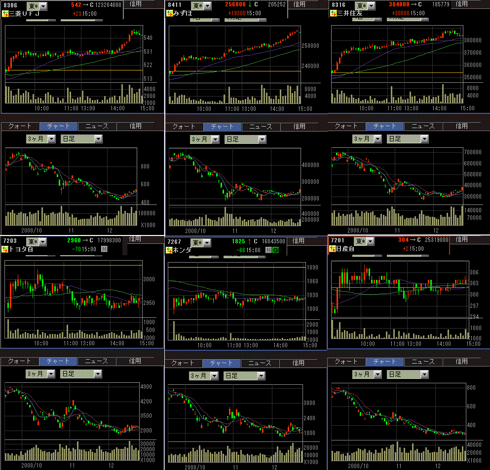 クライスラーが全工場を一か月操業停止、GMは次世代電気自動車用のエンジン工場の建設を中断、フォードは10工場で休業予定を1週間延長と、ビッグスリーは相当に厳しい様子で、GM、フォードの株価も大幅安となりました。政府による救済策は、早ければ今夜にも発表というニュースが出ていますね。政府からのコメントでは事前調整型の破産法適用も視野に入れているみたいですが、これが譲歩を引き出すための交渉用の言葉なのか、本気で考えているのか判断がつかないです。