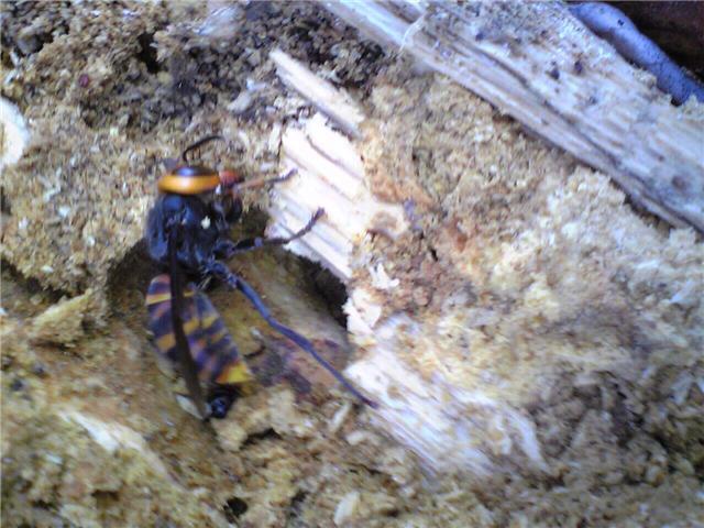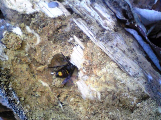 ハサミムシ、スズメバチの女王?ハサミムシは石ころの下に穴をほっていました。キイロスズメバチでしょうか?はちはコナラの木の3年ぐらいたった朽木にもぐりこんでいました。コクワガタが出た後に入ったようです。