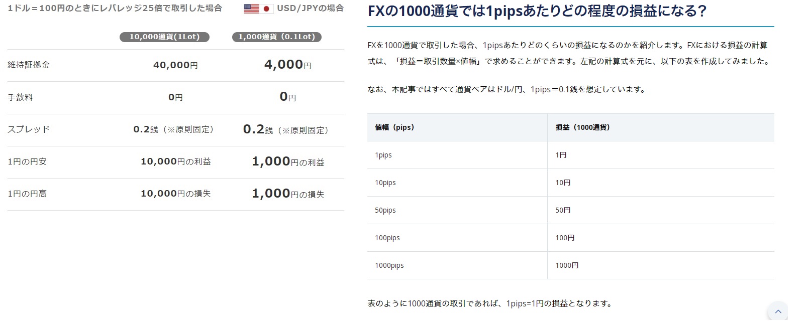 ドル円を1,000通貨買って1円動けば1,000円の損益になります。
