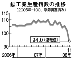 経済産業省が26日発表した11月の鉱工業生産指数(速報値、2005年=100)は94.0となり、前月に比べて8.1%低下した。2カ月連続の低下で、マイナス幅は統計上さかのぼれる1953年2月以降で最大。12月以降も生産の減少が続く見通し。 11月の鉱工業生産の前月比低下幅は事前の市場予測(6.6%)を上回った。これまでの最大の低下幅は2001年1月の4.3%で、これを大きく超えた。前年同月比は16.2%低下し、1975年3月以来の大きな低下幅だった。経産省は生産の基調判断を「急速に低下している」として、前月の「低下傾向」から3カ月連続で下方修正した。