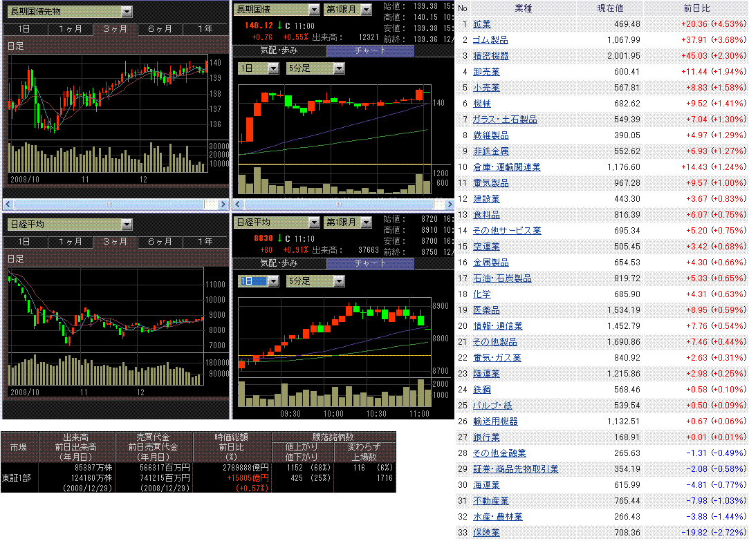 月末は、株高・債券高になることが多い印象です。日経平均の騰落を2008年の各月の最終取引日について調べたら、12回中6回が上昇でした。微妙な数字ですが一年で40%下がったことを考えると月末は上昇しやすかったといえるかもしれません。債券先物はトントンか上昇だけしかなかったです。