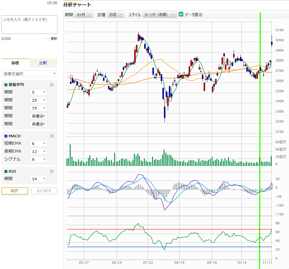 良い感じの営業利益増の発表が出た事で、良い感じに上がりました。