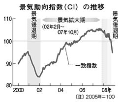 内閣府は1月29日、学識経験者による「景気動向指数研究会」を開き、2002年からの景気回復が途切れ、いまの後退局面に転換した「景気の山」を07年10月と判定した。戦後最長の景気回復は69カ月で終わり、07年11月から後退局面入りしたことになる。この結果、足元の景気後退がすでに1年以上続いていることが判明。 米国では全米経済研究所が日本とほぼ同時期の07年12月からの景気後退入りを認定。ユーロ圏も08年7-9月期に2四半期続けてマイナス成長となり、事実上の後退局面入りが確認されており、日米欧の同時後退が明確になった。