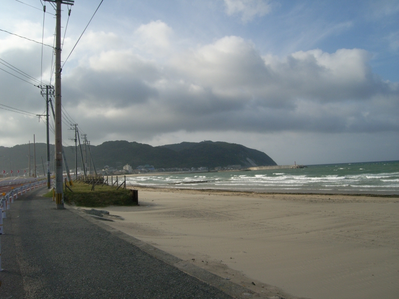 島の手前の砂浜で・・・ガビーン♪サーファーが喜ぶ波がっ♪つうか、砂を巻き上げてまつ♪ハイ