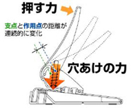 支点と作用点の距離を縮め、支点の位置が連続的に変化する機構によって、従来製品と比べ約50%の軽い力で穴開けできるようになった。パワーアシストメカニズムの技術には、