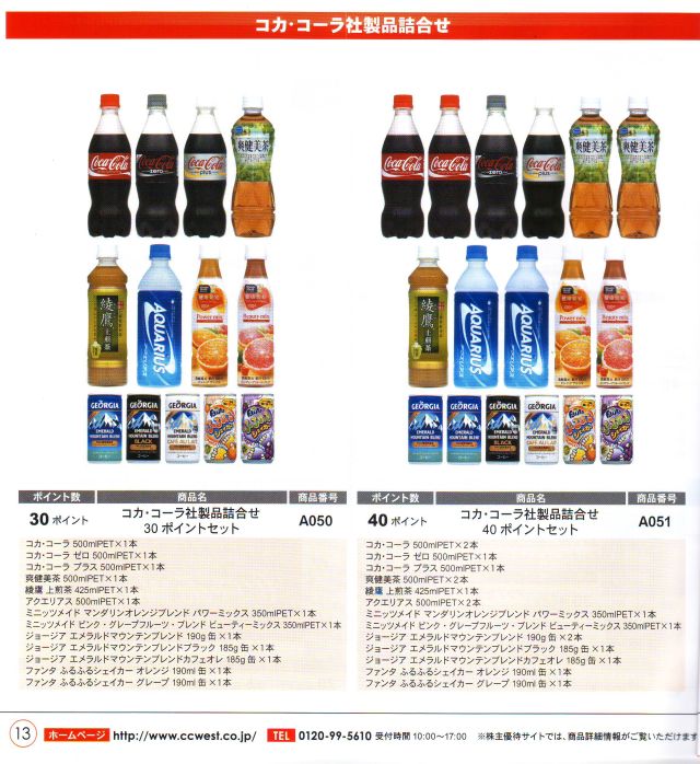 組み合わせが多すぎて全部は列挙できませんが、目安としては30ポイントだと( http://ccwest.sr-s.co.jp/products/list.php?category_id=30 ) の様に500mlペットボトル商品なら12本、缶コーヒーなら15本と交換可能になります。