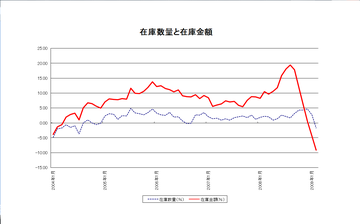 数量ベースと金額ベースの在庫の動きを図で表してみました。金額ベースの下落幅が大きいことが読み取れます。