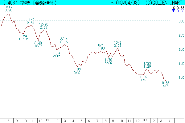 ではもうひとつのチャート2。こちらは三市場の貸借倍率でござる。期間が異なるので比べにくいものの、こちらはずっと減り続けており、1月以降も下げ続けてまする。つまりは、1月以降も下がると思って売り残がどんどん増えていったのに対して、相場の方は買い支えもあったのか底堅く下がらず。たまらず買い戻しが続いているのではないかと推察できるかと存じまする。