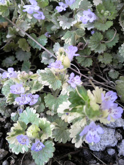 班入りのかわいらしい丸い葉っぱに、小さな淡い紫色の花を咲かせています。