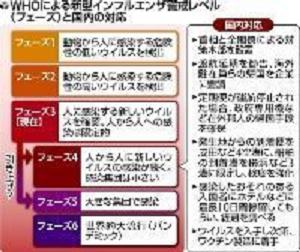新型インフルエンザの警戒レベルは6段階あり、「4」は世界的な大流行に結びつく可能性を認定するもの。これにより日本を含むWHO加盟国は、インフルエンザに対する国内の準備態勢を強化することを求められる。