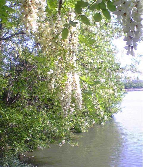 藤かと見間違うような白い房が綺麗で、ひらひらと花びらが落ち、水面に浮かぶ頃綺麗です。いい香りがしています。長野のアカシアの蜂蜜はこれからとられています。最近伐採がされ養蜂もたいへんそうです。