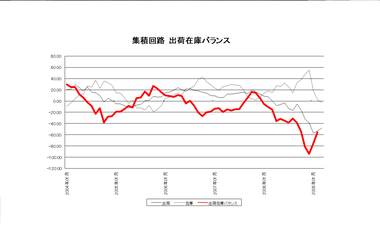 この鉱工業を構成する製品の中で、注目度の高い集積回路(半導体)を見てみましょう。この図は出荷在庫バランスです。したがって数量ベースであることにご注意ください。
