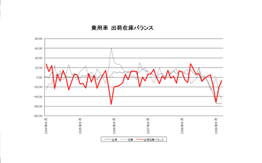 さらに、もう1つ気がかりな乗用車を見てみましょう。これも出荷在庫ばらんすです。意外なことに、在庫調整の進展と出荷の底打ちから、出荷在庫バランスの改善は、集積回路以上に鮮明です。