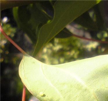 ちょう , アオスジアゲハ , 卵 :アオスジアゲハも卵を産みに来ました。水を撒いとけば給水もしてくれます。給水中は手で捕まえられます。幼虫も卵も葉の裏側で過ごしますが、小さいうちは鳥に狙われないので葉の上側にいることもあります。卵は葉の新芽の外側が多いようです。食草はクスノキで楠木正成をイメージしてか、学校には必ず一本は植えて有ります。探すと卵や幼虫が見つかるでしょう。1.給蜜するアオスジアゲハこれはめったに撮れません。2.給水中3.卵が葉裏の下の方に見えます。