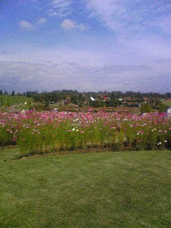 子供たちが遊具で思い切り遊んでいる間に新鮮な空気を胸いっぱい吸って、緑の山並みと青空、そしてピンク色のコスモスの花を眺めて心身ともにリフレッシュしました。