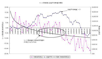 そこで、今回は「リース取扱高」と「日経平均株価」の関連性を見てみます。仮説としては、「リース取扱高」は「日経平均株価」の下落より先行するのではないか。なぜなら、リースは中小企業の利用が多く、景気悪化の影響はまず相対的に弱い中小企業から兆候が現れると考えられるためです。