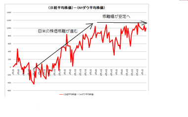 しかも、日経平均株価の上昇率がダウ平均株価を上回ることが多く、日米の株価乖離が縮小する兆しを見せません。