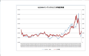 実は、株価は商品市況の動向に敏感に反応します。CRBインデックスと三井物産の株価を見てみましょう。極めて高い連動性を示しています。総合商社の株価を予想するときに、利益の動向に目を奪われてはいけません。国際商品市況の動向を見ることです。