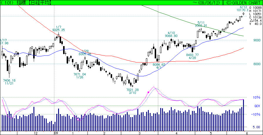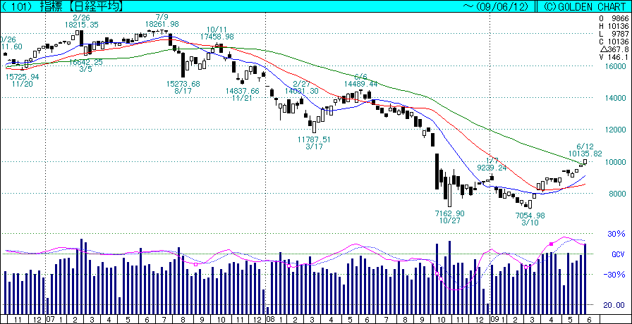 今週の課題は、日経¥10,000、もしくは52週線を下回らずに、値固めをすることかと。今は52週線が¥9,800どころなので、「押し目」と単純に考えると、ここは妥当な線のように思っておりまする。また、仮に52週線を下回ったとしても、まだ25日線がさらに下にあり、ここを割らぬ限りは上昇相場継続と見ておりまする。