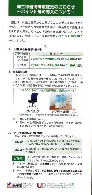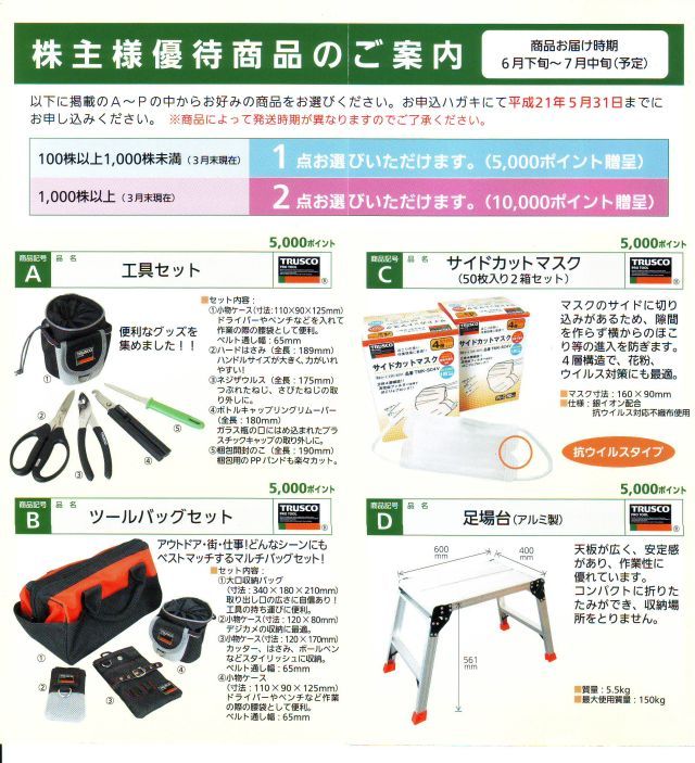 写真右に10000ポイントの商品が掲載されていますが、100株(5000ポイント)しかない場合も今回のポイントを繰越、次回のポイントと合算する事で次回10000ポイントの商品と交換と言う事もできる様になりました。