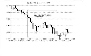 対ドル円レートの動きを15分足でみると、前場での急速な円高の進行、後場での円の高止まり、そして大引けにかけて再度の円高の動きなど、日経平均株価とほとんど同じ動きになっています。