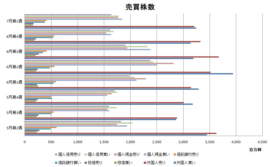 個人は現金は139億円の売り越しだったものの、信用は347億円の買い越しで、トータル207億円の買い越しとなった。