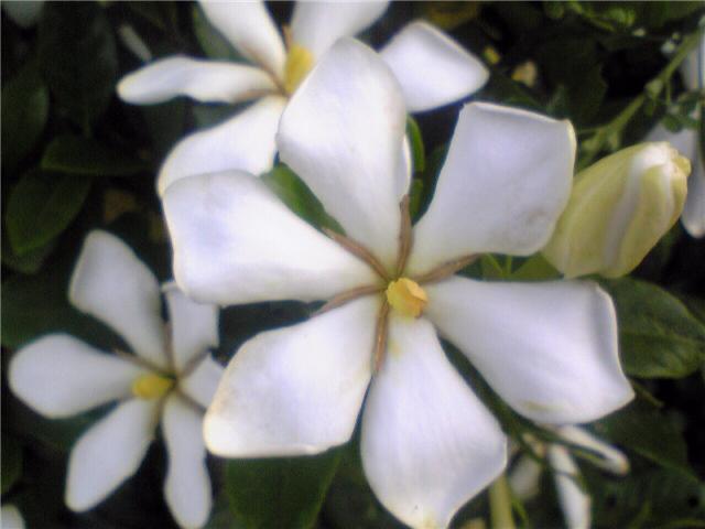 コムラサキ , はな , クチナシ:コムラサキも秋には実のなる木です。クチナシはすごいにおいをさせて咲いています。これも実が成り、天然色素の原料にもなります。