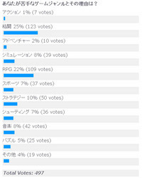編集元:ニュース速報板より「苦手なゲームジャンル、格ゲーとRPGがぶっちぎりの1・2位」1 スカシタゴボウ(福岡県) :2009/05/16(土) 15:20:59.96 ID:kIRnAhev ?PLT(12101) ポイント特典Game*Sparkリサーチ『あなたが苦手なゲームジャンルとその理由は?』結果発表 毎週恒例の読者参加型アンケートコーナー『Game*Sparkリサーチ』。「あなたが苦手なゲームジャンルとその理由は?」というお題で皆様から集まった投票結果をご報告。 結果を見てみると"格闘"および"RPG"が苦手と言う方が圧倒的に多いようです。苦手な理由として"格闘"は「力の差が出易い」「コマンドが入力出来ない」、"RPG"は「時間がかかる」「レベル上げが面倒」といった意見が挙げられています。 さてその他のジャンルはどのような苦手な理由が挙げられているのでしょうか。読者の皆様から寄せられたコメントを幾つかご紹介します。続きはソースでhttp://gs.inside-games.jp/news/187/18782.html