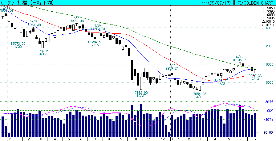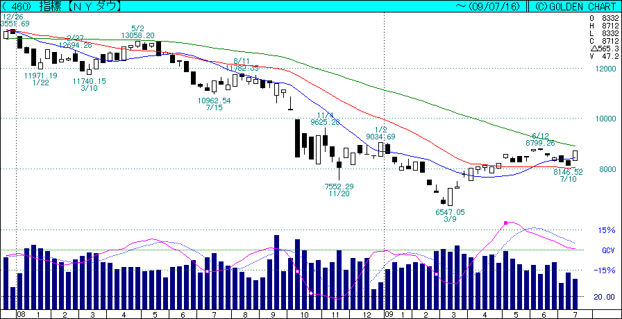 今週の課題として、まずダウが下げずに現在の水準を保てるかどうか。日経は週足が安値圏での差し込み線なので、期待は持てるものの、52週線に頭を押さえられているので、やはり紐育次第でござりましょう。