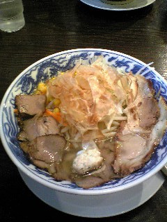 写真では分かりづらいかもしれませんが、麺の上にのっているのはかつお節です。手前に白く見えるのはバターではなくて、しそ入り鳥つくねで何個か入っていました。