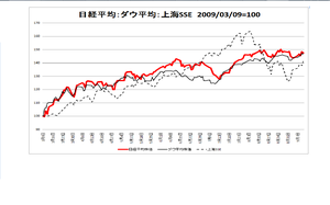 ご参考までに、中国の株価動向(上海総合指数)を加えたチャートを作成しました。日経平均株価、ダウ平均株価と同様に、今年3月9日を100として指数化しています。