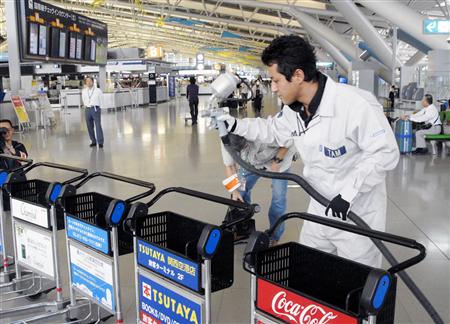 関西国際空港会社によると、日本の空港では初の試み。手荷物カート約2300台、エレベーターの押しボタン約50カ所、トイレの個室扉約500カ所などが対象で、19日に完了する予定。