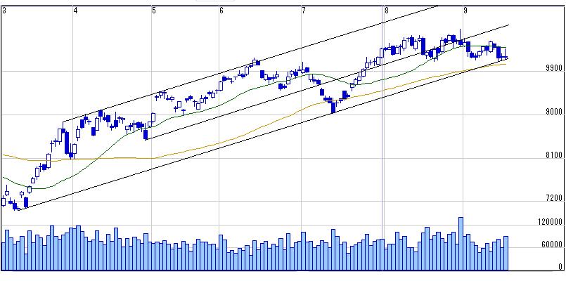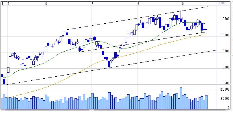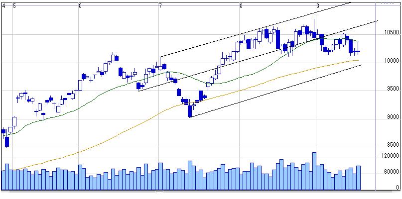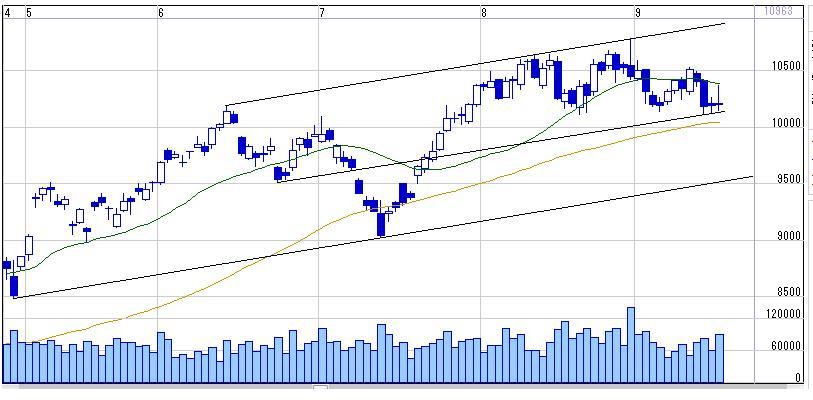 ・画像2の下値ライン10170近辺と画像1の真ん中ライン10140近辺、週足下値支持ライン10120近辺が重要な下値支持ラインと考えます。