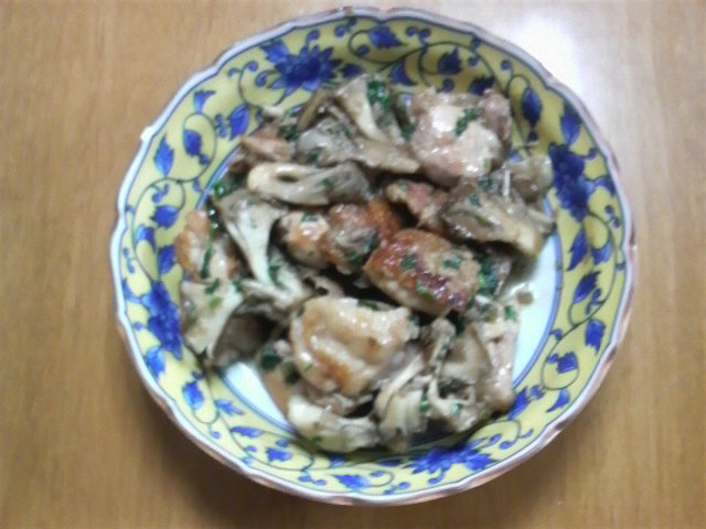 今回の料理は、まいたけににんにく、さらにはパセリとパン粉を合わせるので、いったいどうなるのか不安だったものの、案外取り合わせが良く、家族にも好評でござりました。ただ、大食いの息子ふたりが競って食べ、今宵も1kgの鶏肉が露と消えましたが…(T_T;