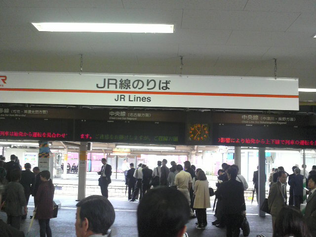 この写真、駅で困り果てる人々が溢れている図で、不謹慎かとは思ったものの、あまりの惨事に撮影させて頂きました。