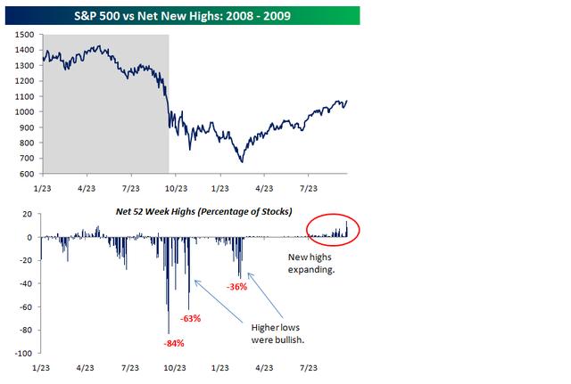 With the overall stock market approaching new bull market highs, the number of new 52-week highs in the S&P 500 is expanding rapidly. As shown below, the net new highs indicator has come to life on the positive side after remaining stagnant for a few months. Because the year-over-year change in the market remained very negative up until just recently, stocks were not hitting new 52-week highs even though the market had been rallying strongly. Now that we're above levels that we were at one year ago, we're getting numerous 52-week highs on a daily basis. This is to be expected and will remain a bullish sign as long as the number continues to expand. If we see the number of new highs stop expanding or even start contracting, this will be a troubling sign that the bull market could be running out of steam.
