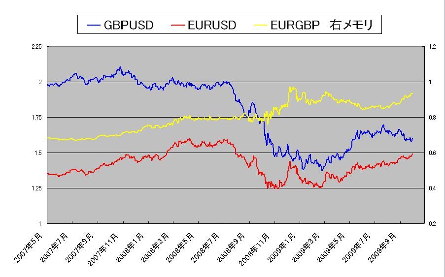 その関係を示したグラフです。  黄線はその比率と等しい EURGBP