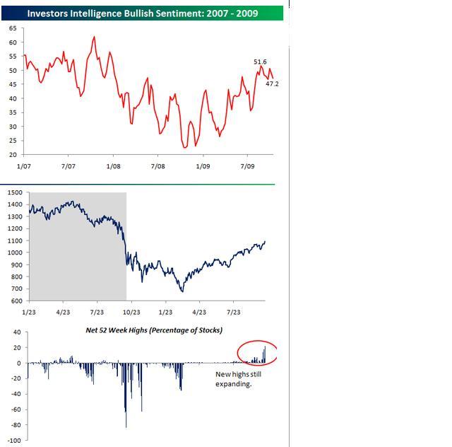 With the Dow up more than 50% since its lows in March, it is no surprise that sentiment among newsletter writers has improved dramatically. As shown below, the percentage of bullish newsletter writers has increased from a low of 22.4% in October 2008 to 47.2% today. While sentiment has improved, we would note that some investors are still uneasy. With bullish sentiment below 50%, this implies that over half of newsletter writers are anticipating a bear market or at least a 10% correction. Additionally, even as the major indices have all hit new highs off the lows, bullish sentiment is down from its peak of 51.6% in late August and at its lowest levels since the first week of August.